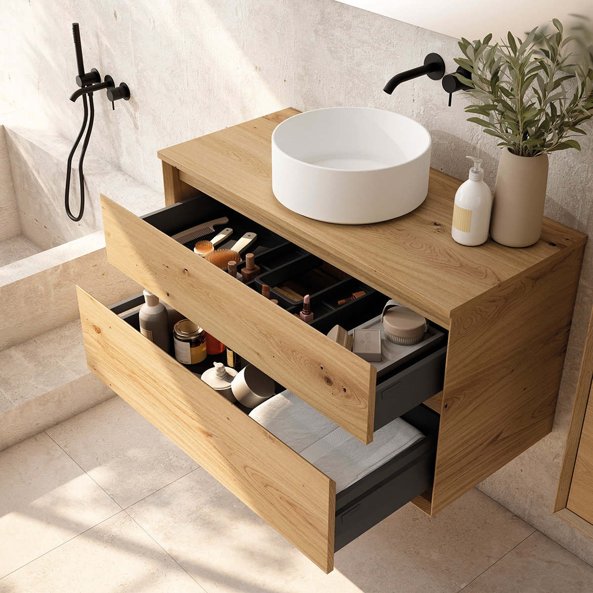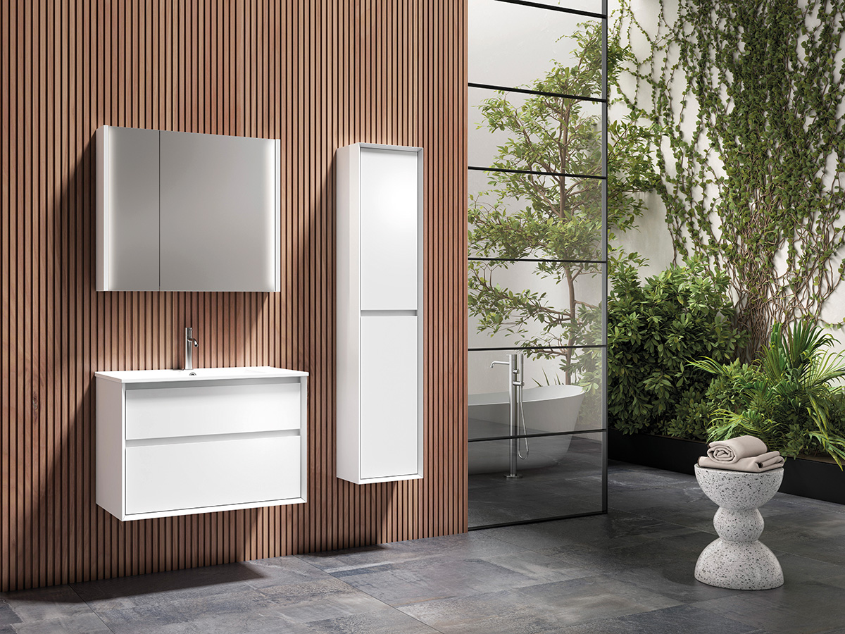 Fabricado en melamina con poro sincronizado 19 mm, con canto de apertura a 45 grados, sin tirador. Altura mueble 55 cm.